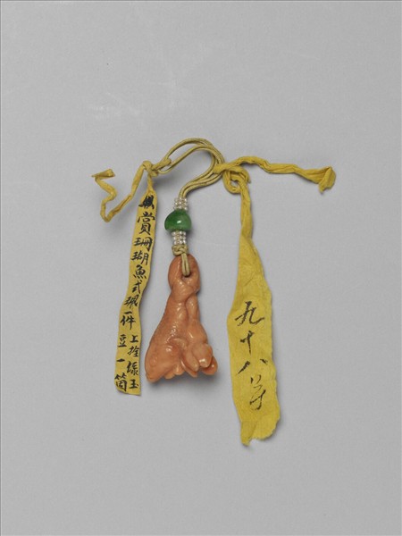珊瑚墜,作魚式。整器琢成魚躍出水狀,魚隻鼓鰓翹首,魚身一側以陰線刻劃出片片鱗鰭,一側以淺浮雕琢卷葉荷花與魚腹相連襯飾。魚尾部鑿有一孔,以黃縧穿繫貫飾一粒翠玉珠子,上下緝白米珠。