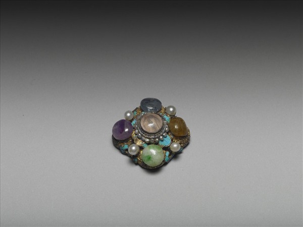 帽正是固定在帽子正前方的飾物,因其具有定位的功能,分辨前後,對準鼻心,故稱帽正。清代的帽正大多與瓜皮帽密切相關,帽正的質料取決於社會地位及經濟條件,講究的可以用珍珠、玉、瑪瑙、紅色尖晶石、珊瑚、貓眼石等名貴的寶石,一般人家也可以用燒藍、料器等。此件是四瓣花式座,嵌翠玉、珍珠及黃、藍、紫色寶石和點翠。