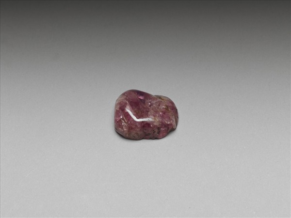 粉色半透明寶石,內有結晶,呈不規則狀,背有兩圓孔。