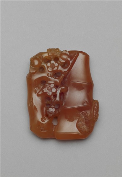 半透明無紋玉髓,質地細膩,顏色橙黃,尺寸偏大且厚,實屬難得。以松竹梅為造型,一半為竹節,一半為梅幹,側面微露一簇松葉,竹節樸素無飾,光潔明亮,梅枝深琢,形成對比。