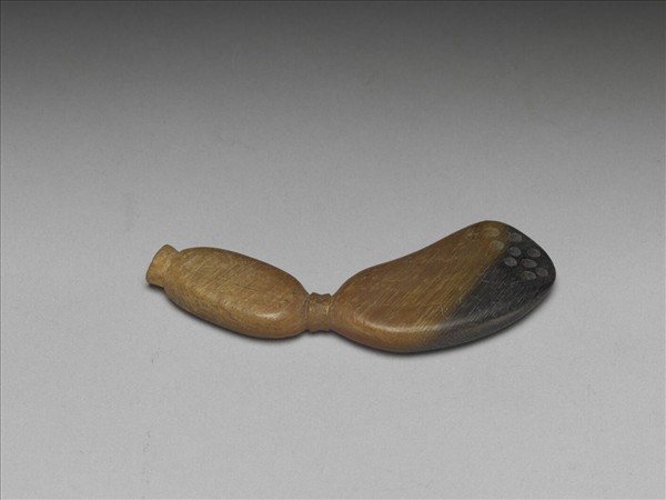 此為角雕藕形佩,利用牛角形狀雕刻蓮藕形之佩飾,中間刻有環狀連結。上窄下寬,口做束狀,九個圓狀紋路交錯排列於下方,下結為灰黑色,可能為牛角原本的顏色。