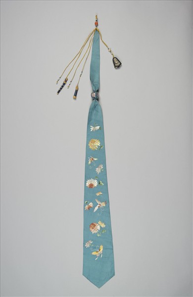 綵帨是繫於胸前,上窄下寬而銳的綢帶,造形類似現在的領帶,只是長可過膝,上端有掛環,可固定在朝褂的鈕扣上,環上佩箴、管、縏、袠等墜角的絲縧。皇后、皇貴妃朝服的綵帨為綠色,繡五穀豐登,佩箴、管等,明黃縧。貴妃用縧為金黃色,妃繡文為靈芝瑞草,餘同貴妃。嬪不繡文。此件為彩繡,為藍色絲綢上繡花蝶紋,繫於縧上,佩青金石刀、小筒等,並束一畫琺瑯花卉圓結。滿人婦女習俗佩巾,除了冠服禮制時規範佩戴的樣式之外,如此作工講究的綵帨,穿著吉服及常服時也可以佩戴,作為裝飾。