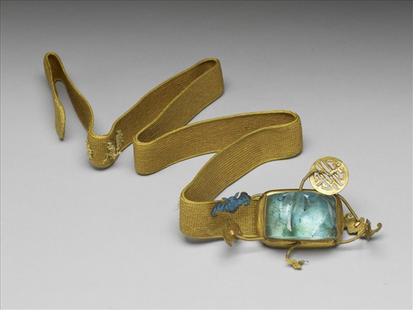 帶扣,呈長方形,一淺藍色晶石鑲嵌於鍍金托上;托之四周加飾五點翠蝙蝠、一點翠團壽,為「五福捧壽」;背面有一水滴形鉤。此帶扣固定於黃色絲帶一端。