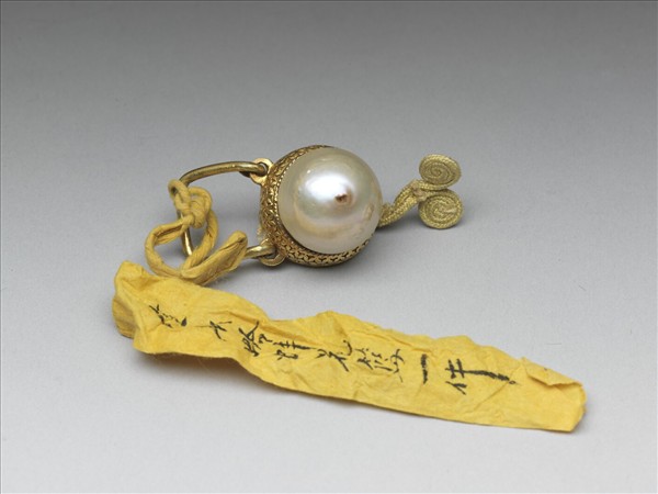 帶扣,呈圓形,銅鍍金托正面鑲嵌一珍珠,側邊帶鉤環,背有二圓鈕,可將帶扣固定。
