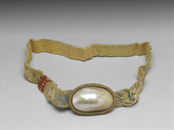 腰帶一副,由彩色絲線編織而成,有桃實、「壽」字等吉祥紋飾,一端接帶扣。帶扣呈橢圓形,銀鍍金托正面鑲嵌一卵形蚌殼,白色帶珠光;背面飾花葉紋,附一水滴形鉤及扣環。