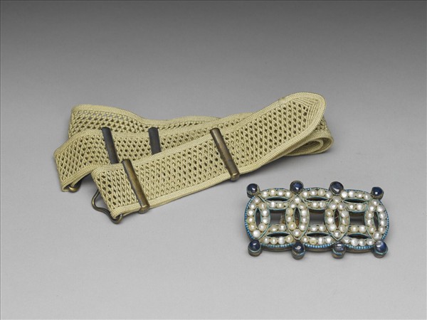 帶扣,為三相連古錢形。銅鍍金托正面嵌滿珍珠,周圍點綴八顆藍寶石,背有二相對水滴形鉤。附黃色絲線編織而成之腰帶。