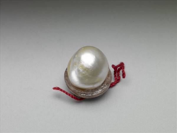 珍珠一粒,呈白色帶珠光,通體渾圓,鑲嵌於一粉紅色碧璽托上。托形似缽,中盛珍珠,底有圓片形金屬座,座底所附鉤環繫二紅色絲繩。