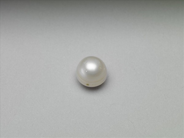 珍珠一粒,呈白色帶珠光,器身近似圓球形、一側較扁,帶小穿孔。
