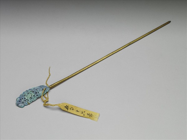 鍍金簪,簪首嵌一片松石,中心雕一囍字,兩旁雕花草蝙蝠紋飾。素鋌。