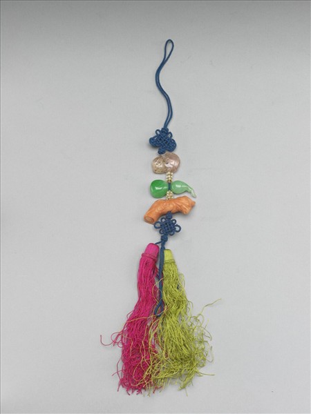 佩墜,串碧璽、翠玉葫蘆、珊瑚玩器,間綴緝米珠,上下各編結子,以藍絲線串成,底繫紅綠兩色流蘇。