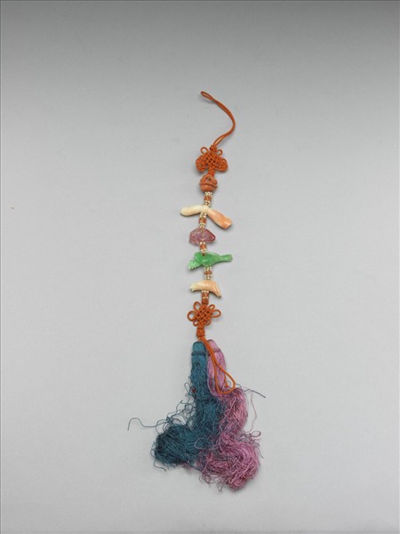 串珊瑚、碧璽、翠玉等雕琢而成的墜飾,間綴緝珊瑚米珠,上下各編結子,以橘色絲線串成,底繫紅綠兩色流蘇。