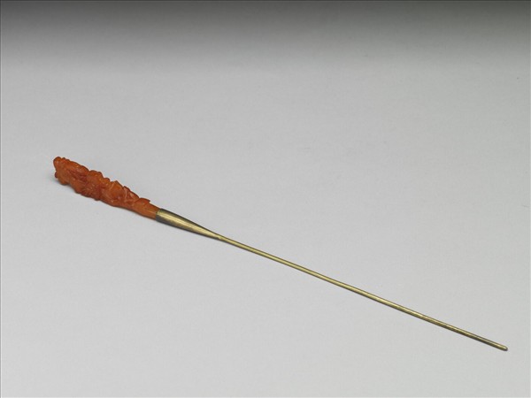蜜臘簪,簪首鑲雕桃枝紋。銀鍍金鋌。