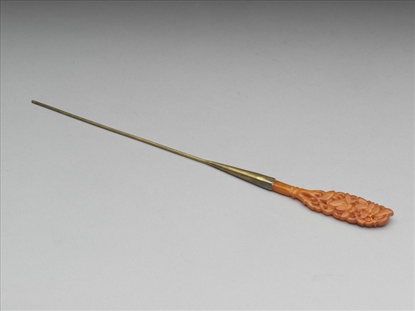 蜜臘細簪,簪首鑲雕木筆花紋蜜蠟。銀鍍金鋌。