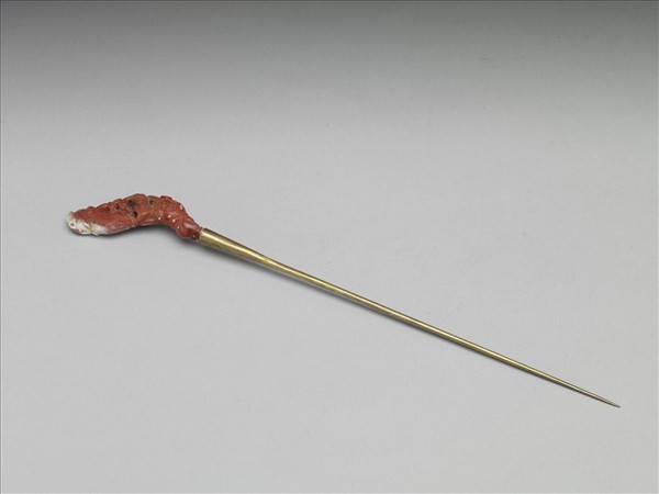 銀鍍金挺,片狀珊瑚為簪首,簪首鏤雕蓮塘花鳥為飾,即一般所謂的「滿池嬌」,這一紋飾主題淵源甚早,在元代時被認為是上層人士所用的紋樣,院藏一些玉頂與瓷器上,也見有這一類的紋樣。