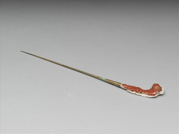 銀鍍金挺,片狀珊瑚為簪首,簪首鏤雕蓮塘水鳥為飾,大片的光滑荷葉與其他鏤雕精細的小物像彼此映襯,甚具設計感。這種蓮塘水鳥紋飾母題,即一般所謂的「滿池嬌」,這一紋飾主題淵源甚早,在元代時被認為是上層人士所用的紋樣,院藏一些玉頂與瓷器上,也見有這一類的紋樣。