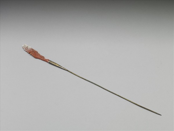 銀鍍金挺,片狀珊瑚為簪首,簪首雕飾折枝花數莖,葉片舒展,花朵盛開而花瓣清晰可見,一片生意盎然。
