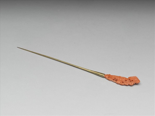 素鋌簪,片狀珊瑚為簪首,簪首雕飾靈芝枝葉。