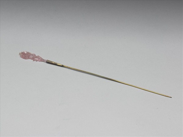 素鋌簪,鋌尖首,片狀粉紅色碧璽為簪首,簪首雕飾蓮花數莖為飾,枝葉彎折,由叢聚而漸漸舒展,盛開又佔據最多位置蓮花位於最上方,是紋樣表現的焦點,也吸引人們的目光。