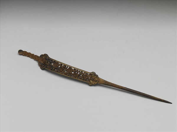 成塊茄楠木簪製成,簪首鏤空雕飾梅花紋飾,上方雕盛開梅花並耳挖,下方雕蝙蝠收尾。整體以木質沉穩的褐色,加上蝙蝠鑲嵌的金絲搭配。兩件為一對。(故雜3204-3205)