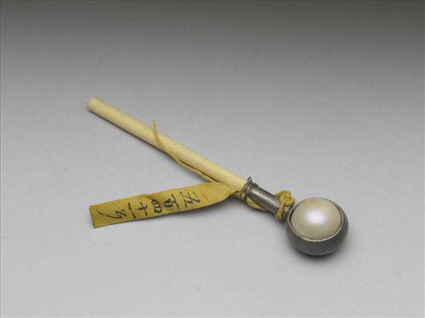 象牙柄太平車,柄一端接金屬環,金屬環箍定珍珠一顆,用於按摩,清代稱這一類的按摩器具為太平車。