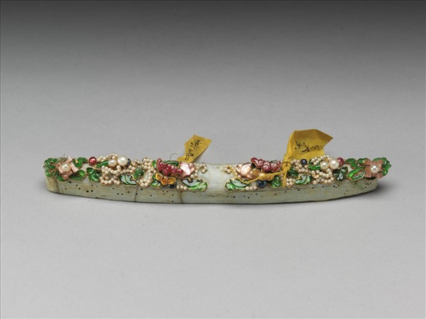 帽花一對,皆是在略近長條形的金屬座上嵌以珍珠、碧璽、翠玉而成,其以翠玉雕成的葉片為襯,成串蜿蜒的珍珠猶如枝條,再加上其間的碧璽蝙蝠、卍字片狀飾件,相映相襯而繽紛多彩,熱鬧又華麗。此器與故雜3219為一對。