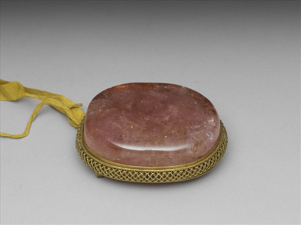 帶扣,纍絲古錢紋帶扣座,座底飾以鏤空冰梅紋,座上嵌一略近橢圓的粉紅碧璽,碧璽打磨瑩潤透亮。