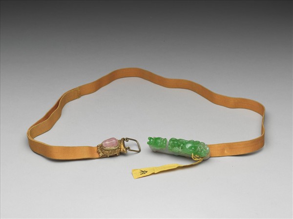 橘色絲帶一端配花葉紋金屬座鑲碧璽帶扣;另端配青白玉帶鉤,帶鉤隨形雕為龍回首之狀,身軀部分則蓮塘水禽,水禽甚大,而蓮塘綴飾其間,頗具設計感。鉤環整體紅綠白相映襯。