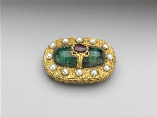 帶頭中央鑲長形透亮的祖母綠,裝飾有如鑲寶石的造型戒環,銅鍍金的表面滿飾纍絲卷葉紋,外圍一圈珍珠,色彩鮮亮。