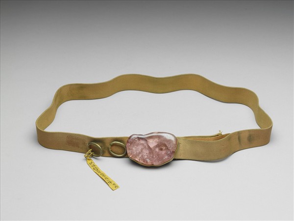 帶扣,無紋銀鍍金帶扣座,上嵌一不規則粉紅碧璽,呈色清透。黃色腰帶上並附有二圓形金屬環。