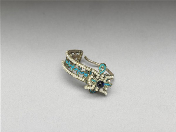 耳環。環面作緝米珠壽字,正中嵌藍寶石。下部作半環狀,周嵌米珠,中飾鏤空點翠雲紋。此器與故雜3249成對。