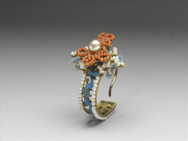 銀鍍金點翠嵌珍珠珊瑚福壽萬年耳環