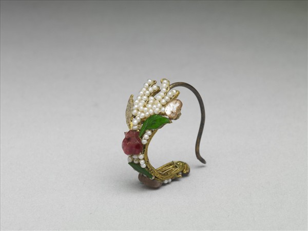 銀鍍金耳環,嵌淡粉紅色碧璽為桃實,綠色玉石為葉,再滿綴珍珠為佛手,寓意吉祥的果實顏色多樣,既繁麗又富貴。故雜3256-3257一式兩件成對。