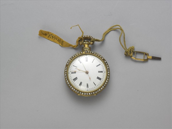 金屬圓形三針式錶,錶盤白色,以羅馬數字為計量刻度。錶殼與錶面邊廓皆鑲嵌珍珠一圈,錶殼外壁還繪有綠地畫琺瑯人物為飾,裝飾華麗。