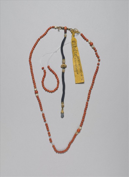 珊瑚念珠一串,疑為準備做成「朝珠」之珠串。本珠串夾有珊瑚佛頭四粒,每顆佛頭兩側各有一珍珠,共八顆珍珠,一個蜜蠟佛頭塔,蜜蠟塔下接一條藍色飾帶,上繫鍍金「背雲」與藍石墜角各一個;在背雲上下與佛頭塔附近綴飾米珠。「朝珠」是清朝君臣命婦穿著朝服或吉服時垂掛於胸前的飾物,由一百零八粒珠貫串而成,每二十七粒珠之間夾以一粒不同之珠區隔,稱為「佛頭」,每串朝珠共有佛頭四粒;本件之佛頭即為體積大的珊瑚珠。垂掛朝珠時,頸後方之佛頭下接有一塔狀飾物稱為「佛頭塔」,佛頭塔下接一垂於背後、用以平衡重量之飾物,稱為「背雲」。本件之背雲作如意形,背雲與墜角托座均鍍金。本件另帶有數十餘粒珠子,推測為多餘念珠材料,使本件珠子數量多於一般念珠。