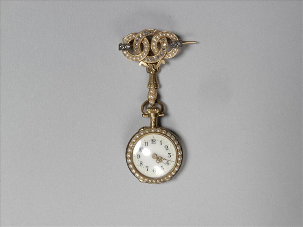 三環橫向連結,後側一長鈎,串聯一瓶形鈎,再扣接一小型錶,錶的背面及外緣鑲珍珠,環形及中間串接的鈎環均鑲鑽,為十九世紀西方製品。