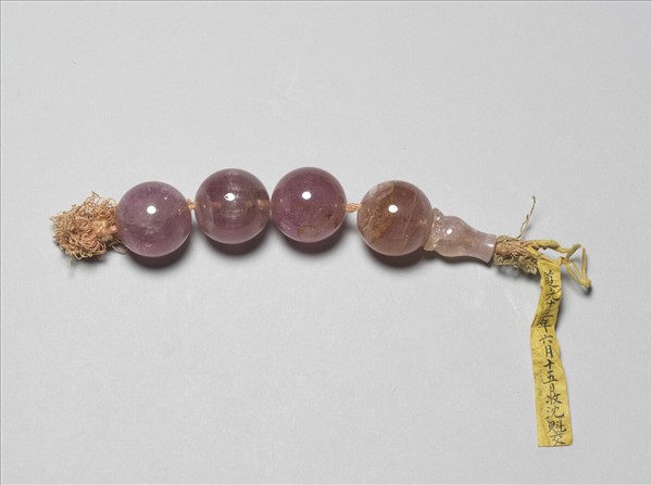 故雜3297~故雜3301為碧璽佛頭四粒與佛塔一粒以紅縧串成,推測原屬「朝珠」之部份構件;除故雜3297是佛塔外,本件與其他三件是佛頭。朝珠是清朝帝后大臣命婦穿著朝服或吉服時垂掛於胸前的飾物,由一百零八粒珠貫串而成,每二十七粒珠之間以一粒其他質材之珠區隔,稱為「佛頭」;本件文物中的碧璽圓珠即為佛頭。通常垂掛朝珠時,頸後方之佛頭下接有一塔狀構件稱為「佛塔」,下垂一背雲。本串佛頭與塔表面皆光素無紋,佛頭塔略有傷破。