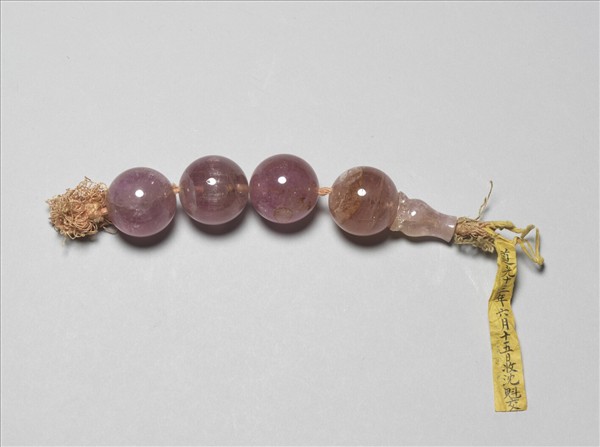 故雜3297~故雜3301為碧璽佛頭四粒與佛塔一粒以紅縧串成,推測原屬「朝珠」之部份構件;除故雜3297是佛塔外,本件與其他三件是佛頭。朝珠是清朝帝后大臣命婦穿著朝服或吉服時垂掛於胸前的飾物,由一百零八粒珠貫串而成,每二十七粒珠之間以一粒其他質材之珠區隔,稱為「佛頭」;本件文物中的碧璽圓珠即為佛頭。通常垂掛朝珠時,頸後方之佛頭下接有一塔狀構件稱為「佛塔」,下垂一背雲。本串佛頭與塔表面皆光素無紋,佛頭塔略有傷破。