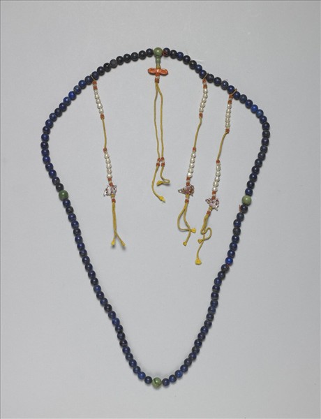 本件是青金石朝珠,間以松石佛頭,佛頭塔下有一珊瑚杵;本件帶有三串珍珠計捻,各帶一紅碧璽玩器。組成本件之珠子表面均光素無紋。朝珠是清朝君臣命婦穿著朝服或吉服時垂掛於胸前的飾物,由一百零八粒珠貫串而成,每二十七粒珠之間以一粒其他質材之珠區隔,稱為「佛頭」;通常垂掛朝珠時,頸後方之佛頭下接有一塔狀構件稱為「佛塔」,本件即帶有一件珊瑚佛塔。朝珠兩旁附有三串小珠子,每串十粒,是為「計捻」(又稱「記念」或「記捻」),佩掛朝珠時一邊一串,另一邊兩串,戴法男女有別──男性將兩串記捻置於左邊,一串在右;女性則為兩串記捻在右。