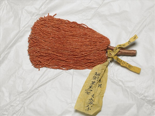 本件由幾百串紅色珊瑚米珠束成一大把,每串均有成百顆珊瑚米珠,推測這些米珠是預備做成珠串或飾件的材料。本件帶黃籤,黃籤內容註明本件共重九兩八錢。