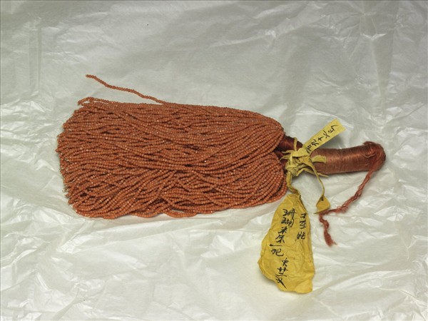 本件由幾百串紅色珊瑚米珠束成一大把,每串均有成百顆珊瑚米珠,推測這些米珠是預備做成珠串或飾件的材料。本件帶黃籤,黃籤內容註明本件共重二十兩。
