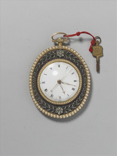 橢圓形錶。圓形錶面有時、分、秒針與羅馬數字,周嵌珠一圈,其外飾橢圓形嵌料石蔓草紋座,上下飾嵌料石五瓣花各一,外再嵌珠一圈;鍍金背面飾花葉紋。附銅匙一,一面鐫楷書「貽拿」二字,一面鐫英文字「JULLMANN & Co.」、「SHANGHAI」。