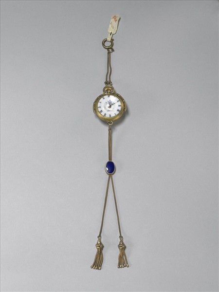 圓形懷錶。有花形時、分針,白色錶面上黑色羅馬數字,軸心周圍繪有卷枝花卉;背面為玻璃外殼,可看見內部機心構造。上繫環扣,下綴藍色琺瑯綴飾及金屬流蘇。