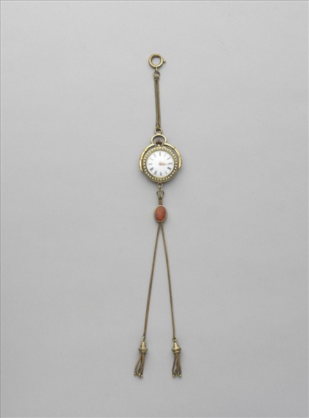 圓形懷錶。有花形時、分針,白色錶面上有黑色羅馬數字及刻度,各數字外嵌一菱形金屬塊,錶面外圍鑲一圈珍珠;背面為紅色玻璃嵌飾金銀卷枝花葉紋及一隻金蝴蝶,外圍亦鑲一圈珍珠。上繫環扣,下綴紅色琺瑯綴飾及金屬流蘇。