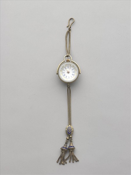 球形錶。錶盤有時、分針與藍色羅馬數字,周飾點雲紋。錶罩於玻璃球中,上繫掛鉤,下綴西洋琺瑯流蘇。