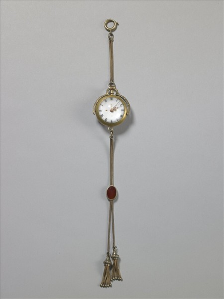 球形懷錶。有花形時、分針,白色錶面上有黑色羅馬數字;背面為玻璃外殼,可看見內部機心構造。錶罩於玻璃球中,上繫環扣,下綴紅色琺瑯綴飾及金屬流蘇。