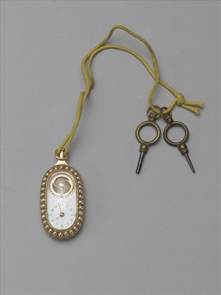 橢圓形懷錶,周嵌一圈珍珠,錶面一側為指針與數字,一側有圓孔,可見內部機件。附銅匙。錶背面裡鐫有英文草書「Wind up to the Left/ For the hands」。