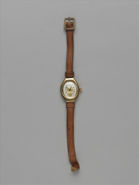 腕錶一只。橢圓形錶身及錶面,黑色時、分針,白色錶面上有黑色阿拉伯數字及刻度,下方有秒針及讀秒用的小刻度,時分針軸心上方有「L. B. Co.」英文字樣;皮質錶帶,正面染紅褐色,一端有扣。