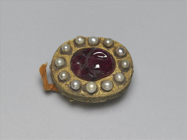 帶扣,銅鍍金橢圓形座,座面及側邊以纍絲裝飾捲葉紋,中央嵌紫紅色寶石,周圍嵌一圈珍珠;鍍金座背面嵌有環扣等零件,可用來扣合。