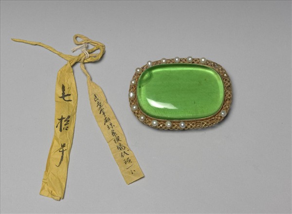 橢圓形帶頭,銀鍍金托座鑲飾澄澈透明的綠玻璃。外廓以連毬紋纍絲鑲珍珠為邊飾。