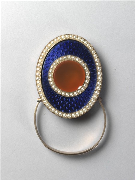 橢圓形的帶板,寶藍色刻劃如光芒狀圓點地紋,中央鑲正圓的透明褐色瑪瑙,再鑲以整圈的珍珠,色澤乾淨透明,造型簡潔,環形的帶銙以螺絲固定,工藝手法俐落。此器與故雜3352為一對。